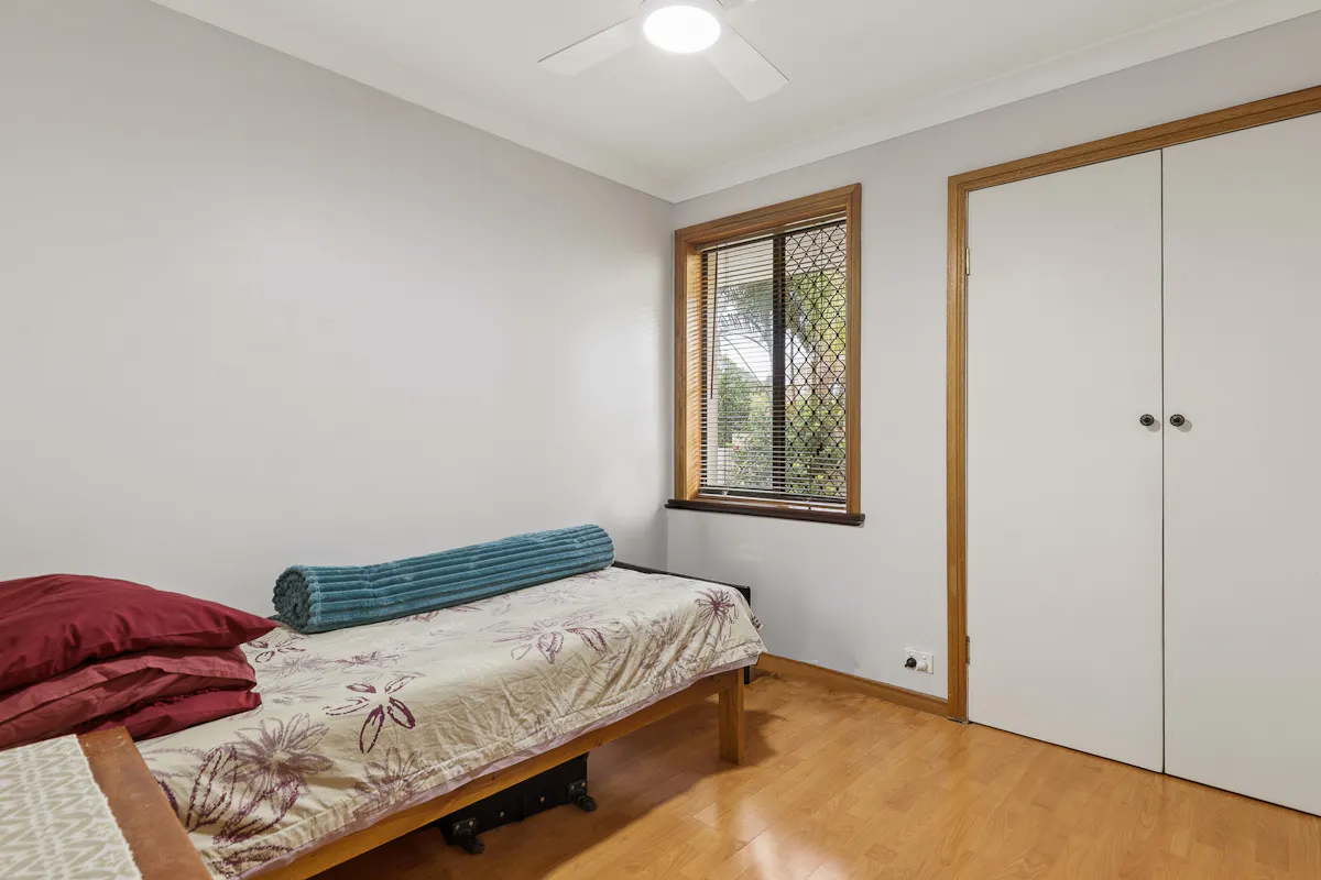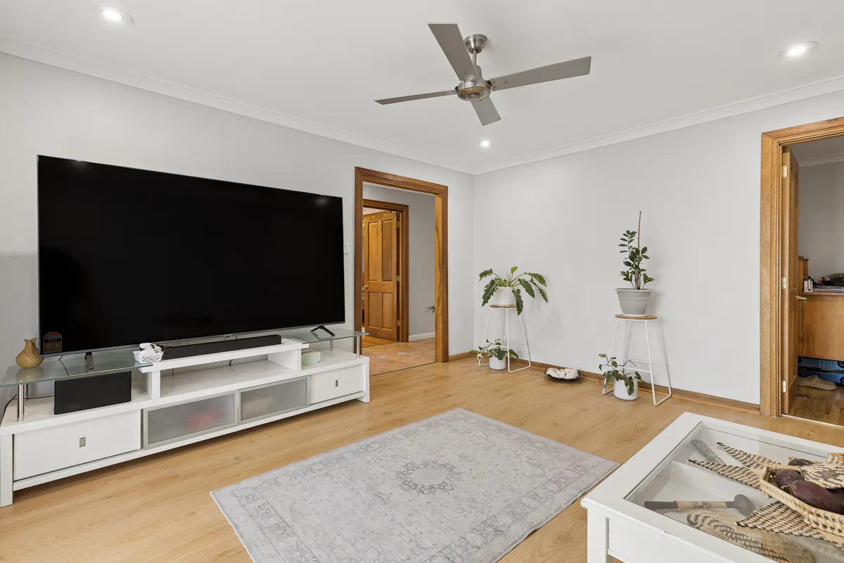 The front lounge room offers a cosy yet spacious retreat, complete with downlights, ceiling fan, and continued timber-style finishes. The master bedroom is privately positioned at the front of the home and features a ceiling fan, reverse cycle air conditioning, built-in storage, and a functional ensuite with modern touches.