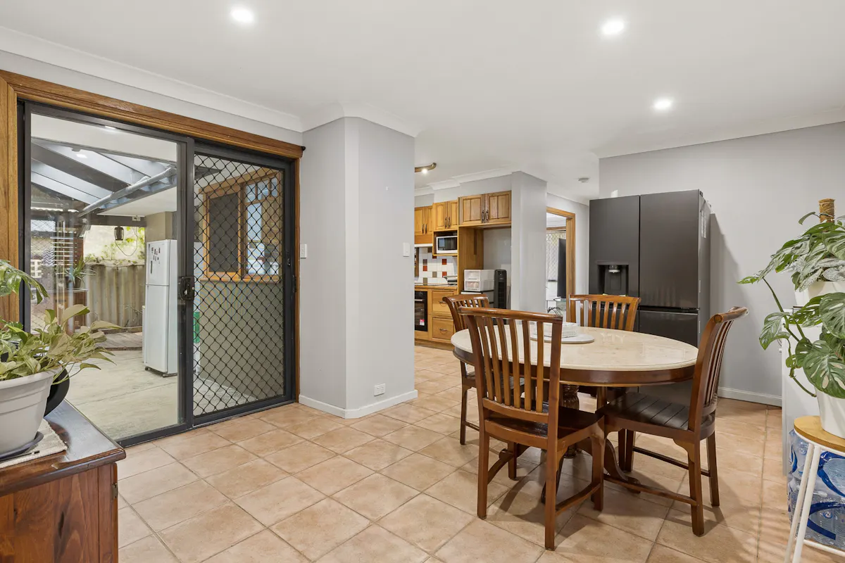 Moving through the home, the central dining area is designed for everyday living, featuring tiled flooring, downlights, and split system air conditioning for year-round comfort. The kitchen embraces a classic aesthetic with timber cabinetry, electric cooking appliances, dishwasher, microwave recess, and a window overlooking the rear entertaining area – adding both practicality and charm.