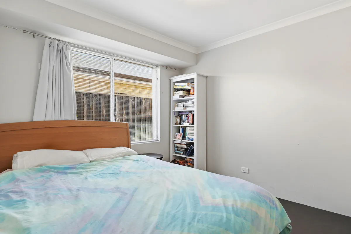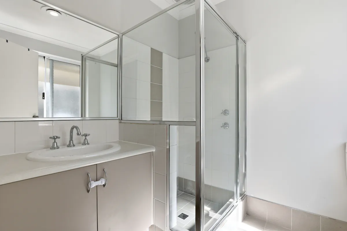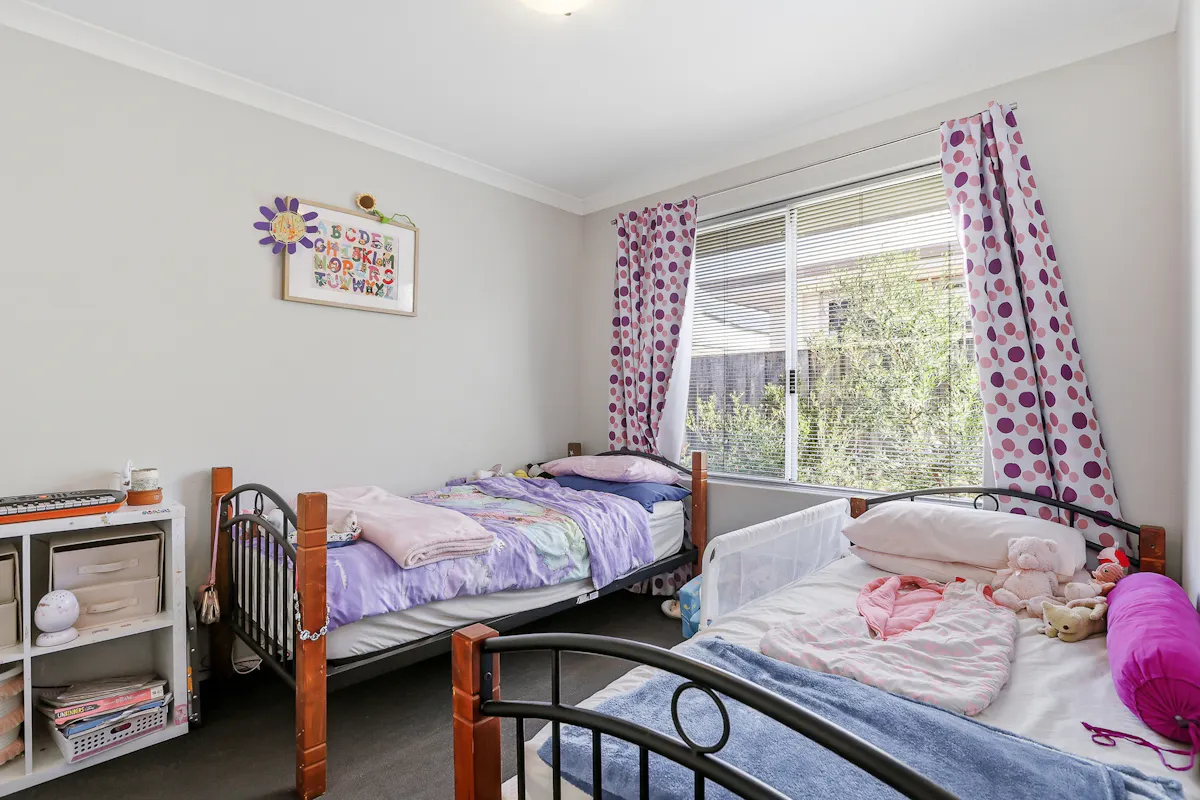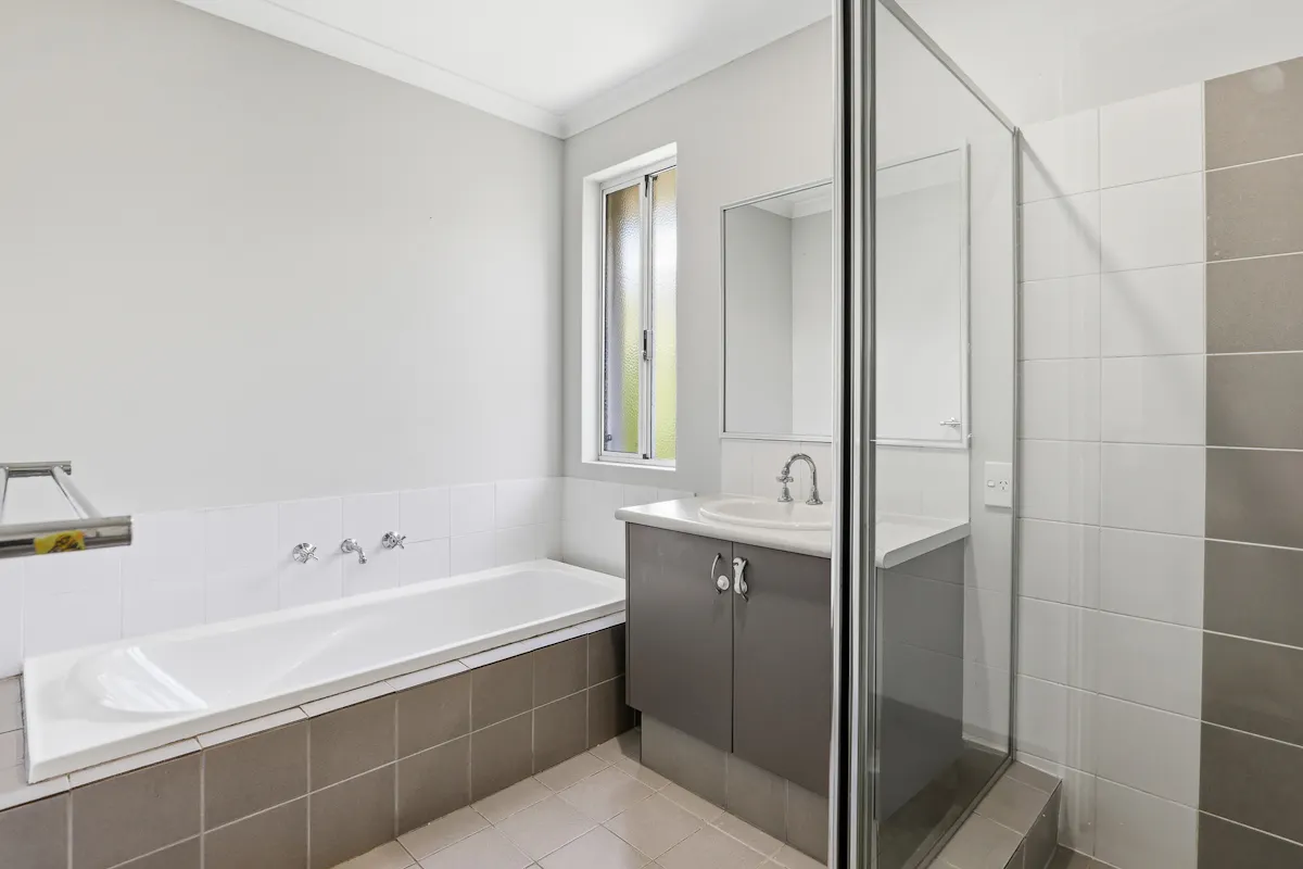 Bedrooms 2 and 3 are both carpeted with built-in wardrobes and are serviced by the main bathroom, which includes a separate bath and shower with neutral finishes.